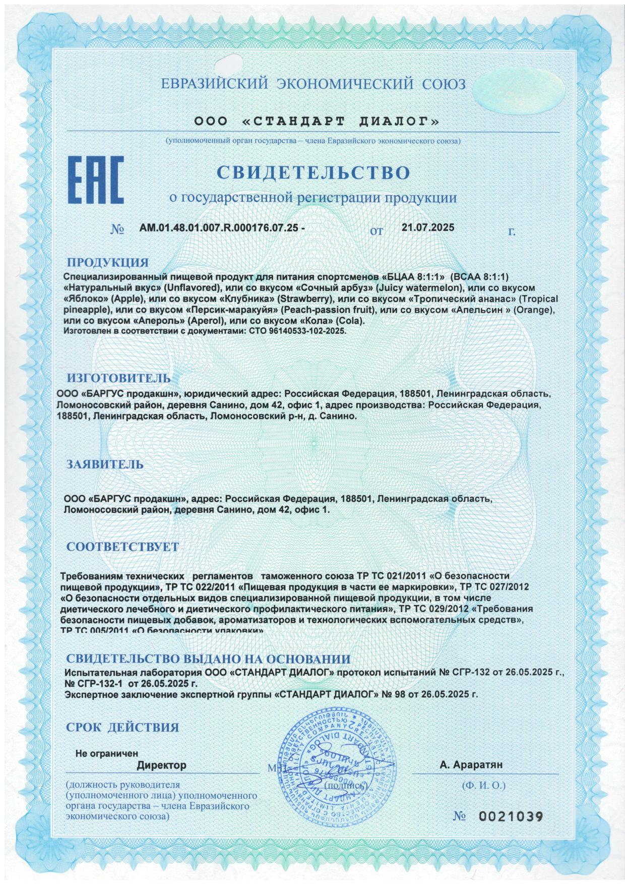 Специализированный пищевой продукт для питания спортсменов BCAA 8-1-1 - комплекс незаменимых аминокислот L-изолейцин, L-лейцин и L-валин в пропорциях 8:1:1. Используется как спортивная добавка для набора мышечной массы, похудения, поддержания текущей спортивной формы. Предотвращает распад мышечной ткани, регулирует уровень сахара в крови, является источником энергии, ускоряет процессы восстановления.