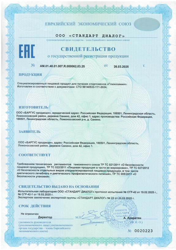 Специализированный пищевой продукт для питания спортсменов Глюкозамин сульфат - это природное вещество, аминосахарид, который является важным строительным компонентом хрящевой и соединительной тканей организма, включая суставы, сухожилия и связки.