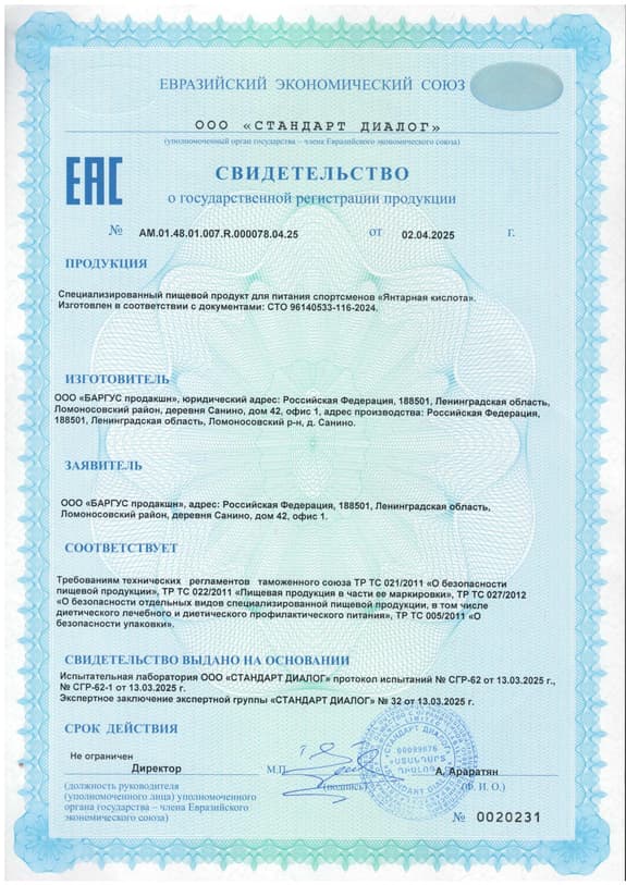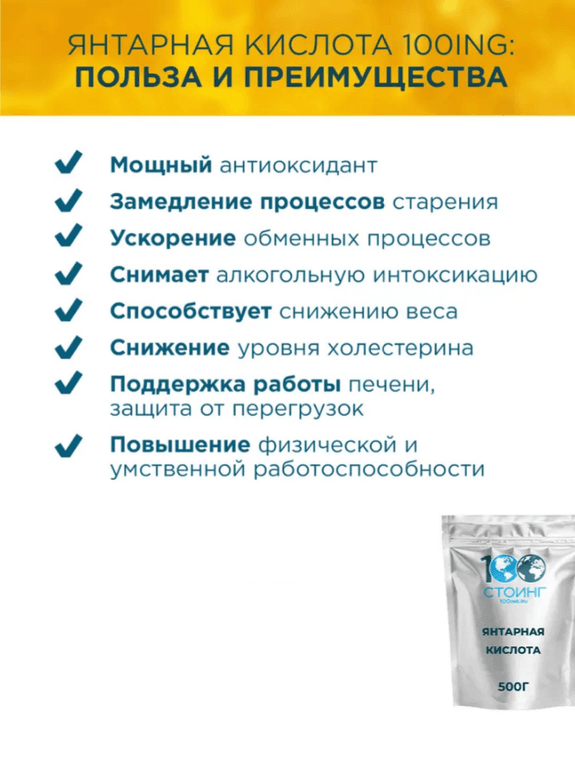 Специализированный пищевой продукт для питания спортсменов янтарная кислота - это органическое вещество, которое играет важную роль в обмене веществ организма, участвуя в клеточном дыхании и синтезе АТФ (энергии)
