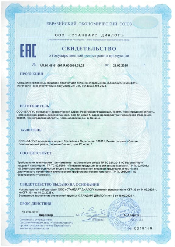 Специализированный пищевой продукт для питания спортсменов хондроитин сульфат - Используется как хондоропротектор и укрепляющая добавка при силовых нагрузках спортсменами.