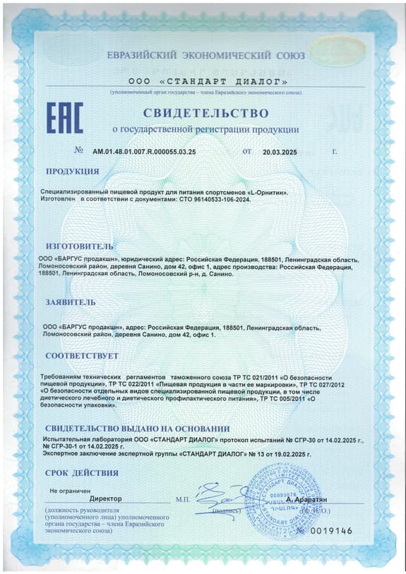 Специализированный пищевой продукт для питания спортсменов L-орнитин - аминокислота, входит в состав незаменимых белков организма. Обладает выраженными гипоаммониемическими свойствами.