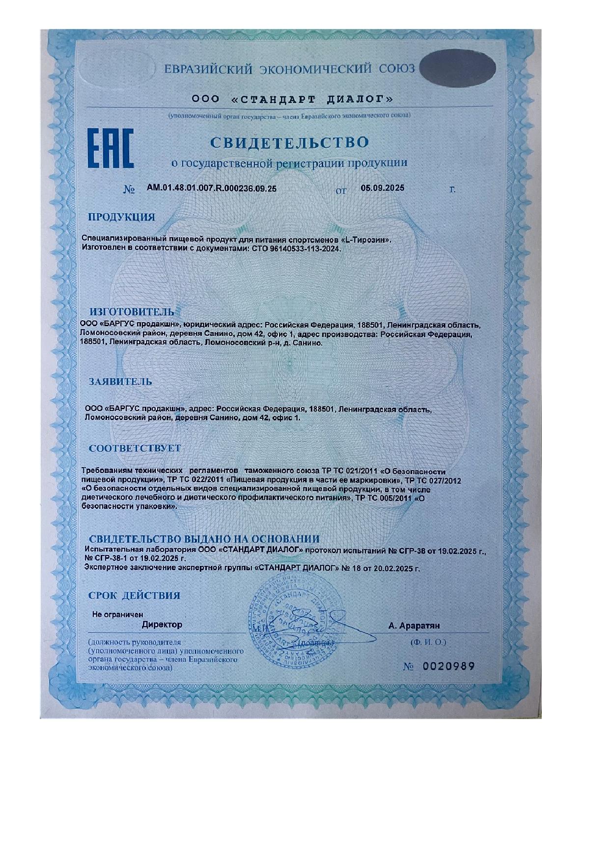 Специализированный пищевой продукт для питания спортсменов L-тирозин - аминокислота, входит в состав белков тканей, является прекурсором дофамина, адреналина и норадреналина.