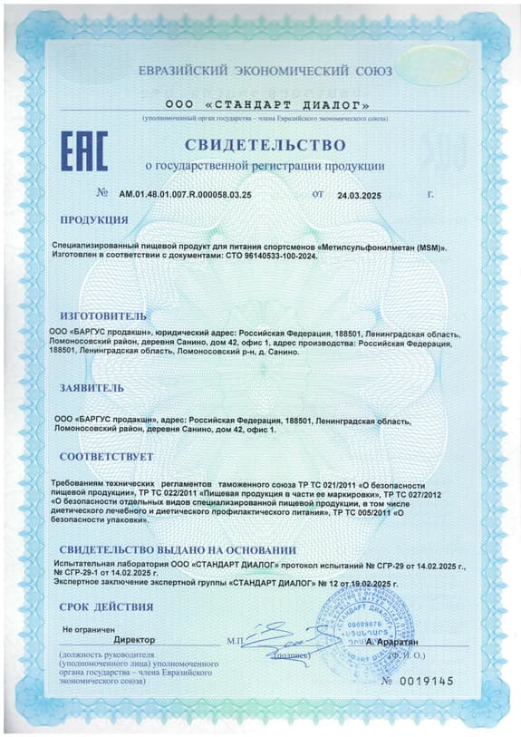 Специализированный пищевой продукт для питания спортсменов метилсульфонилметан (МСМ) - используется как хондоропротектор и укрепляющая добавка при силовых нагрузках спортсменами.