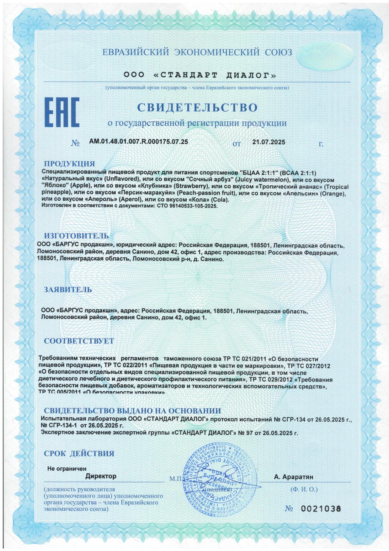 Специализированный пищевой продукт для питания спортсменов БCAА 2:1:1 - комплекс незаменимых аминокислот L-изолейцин, L-лейцин и L-валин в пропорциях 2:1:1. Используется как спортивная добавка для набора мышечной массы, похудения, поддержания текущей спортивной формы.