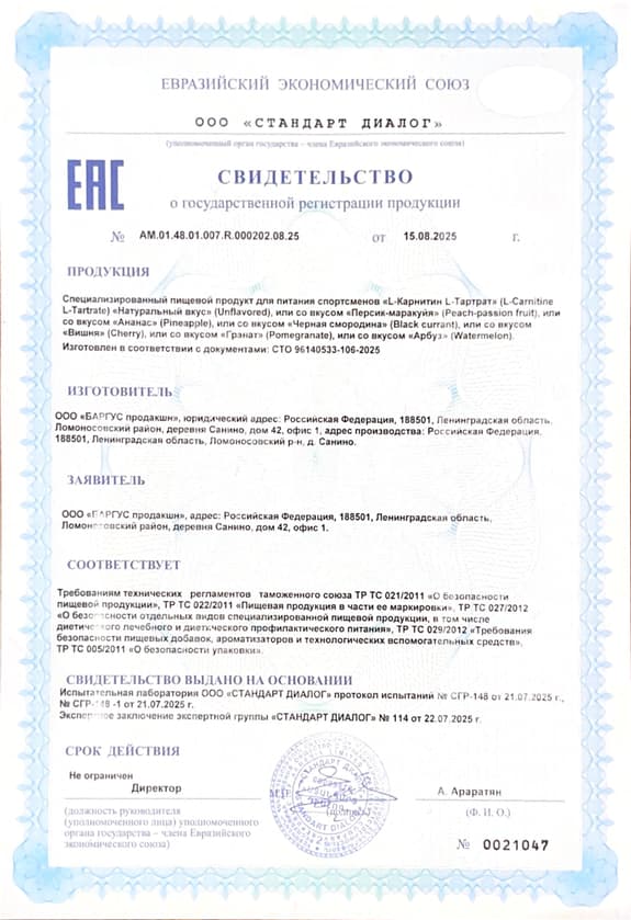 Специализированный пищевой продукт для питания спортсменов L-карнитин L-тартрат – витаминоподобная аминокислота. Используется как спортивная добавка для повышения эффективности физических нагрузок. Считается жиросжигателем, так как способствует похудению.