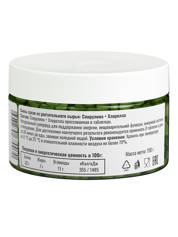 Смесь двух видов сушеных водорослей - спирулины и хлореллы.