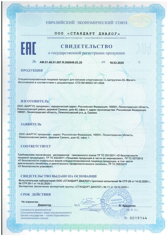 Специализированный пищевой продукт для питания спортсменов Цитруллин – аминокислота азотной группы, участвующая в выработке аргинина в организме. Молекулы цитруллина обладают высокой степенью усвояемости в сравнении с биодоступностью аргинина, а также циркулируют в крови дольше